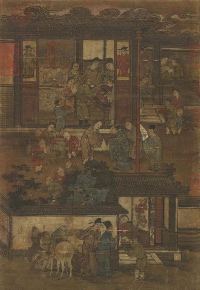 宋代画家李嵩所作的《岁朝图》,神色的便是春节期间蠢笨在门外接帖迎客、主东谈主在院内待客饮酒的喜庆状况。